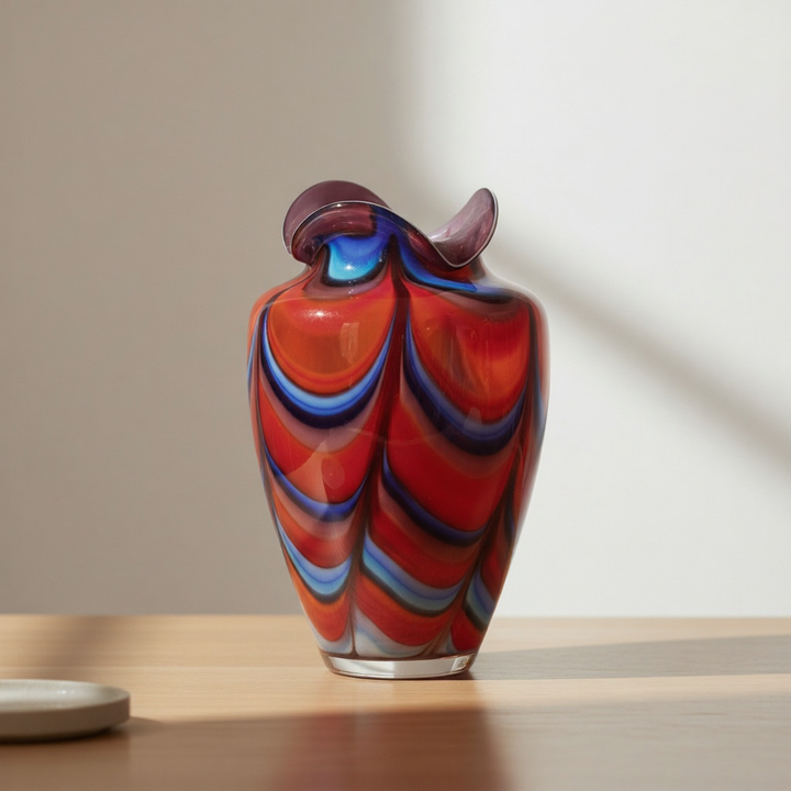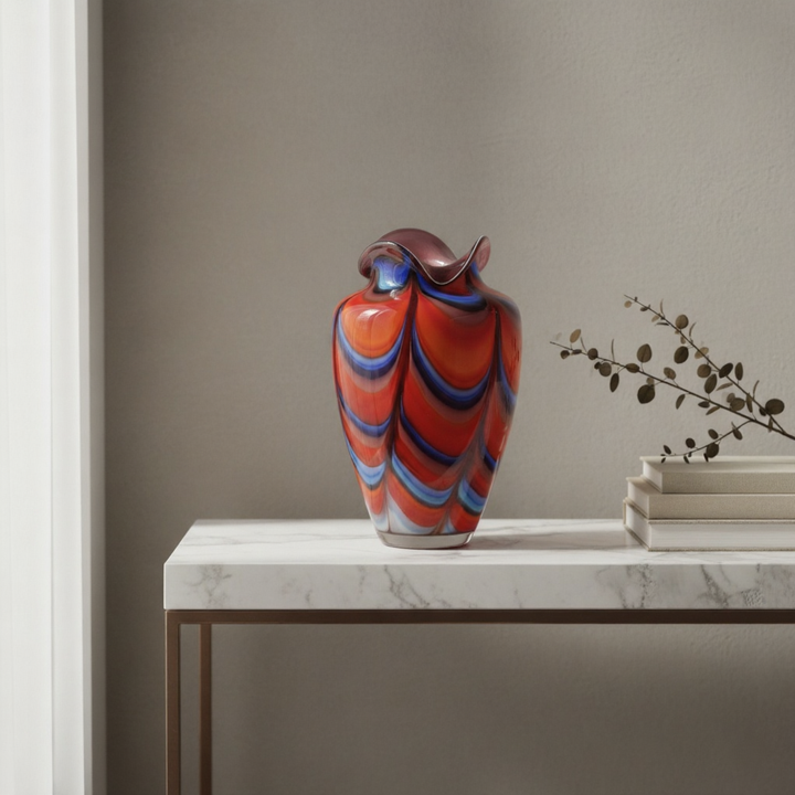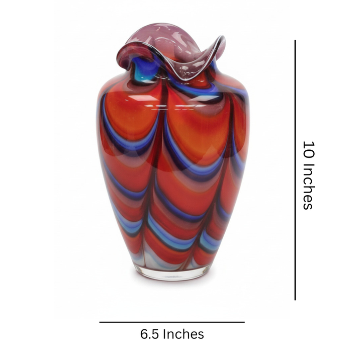 Hand-Blown Art Glass Vase – Vibrant Red & Blue Ruffled Rim Decorative Piece