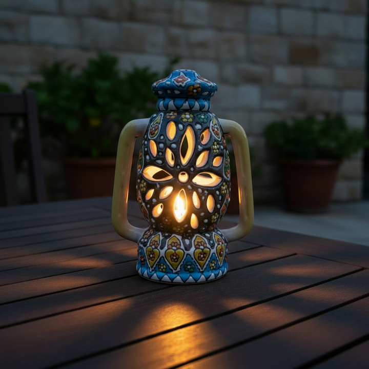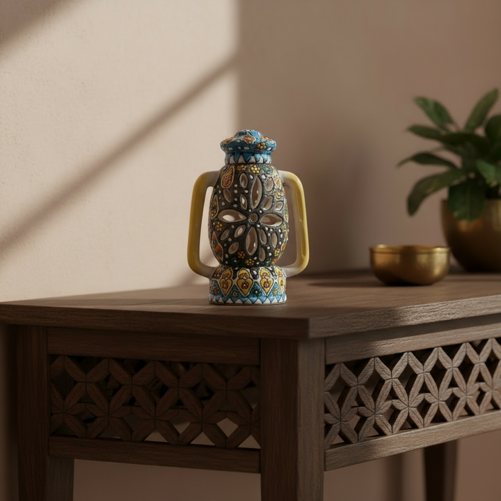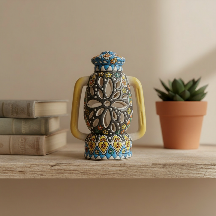 The central chamber is adorned with intricate open-work cutouts in floral and star-like patterns, allowing soft light to pass through and cast beautiful shadows. The base and top are richly hand-painted in vibrant hues of blue, yellow, orange, and green — inspired by traditional Multani blue pottery.
