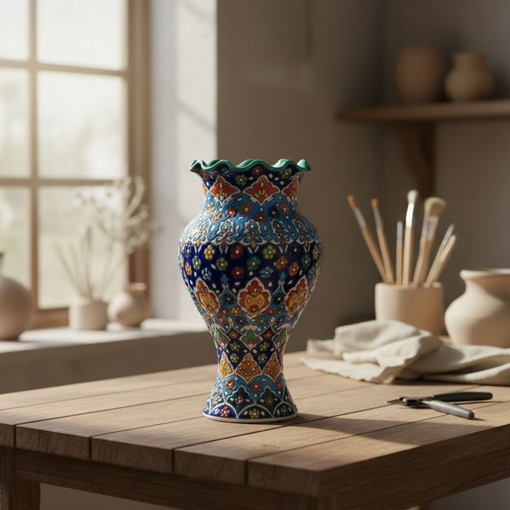 Handcrafted Ceramic Vase with Ruffled Rim & Multani Blue Pottery Design – 12 x 5.5 (inches)