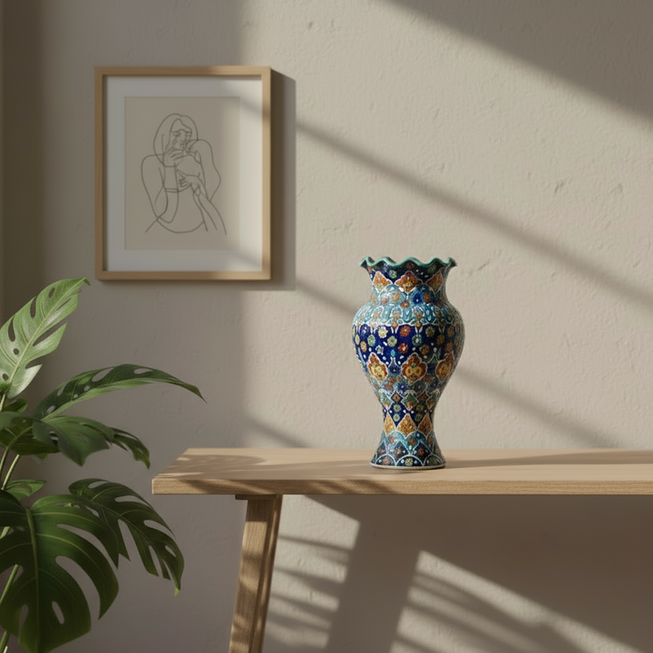 This handcrafted ceramic vase showcases refined elegance and rich cultural artistry. Shaped with a flared base, cinched waist, and rounded body that narrows into a tall neck, it’s crowned by a beautifully ruffled rim resembling a blooming flower.