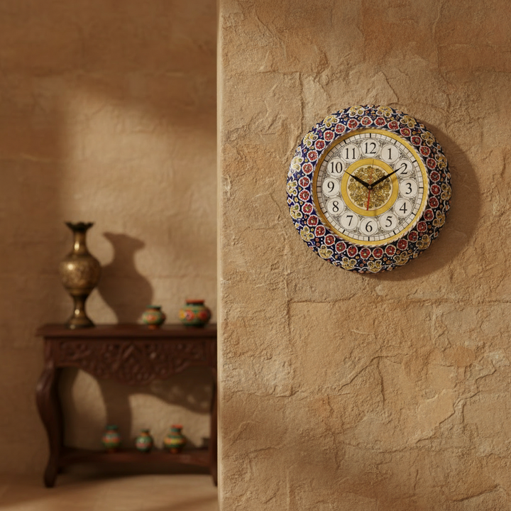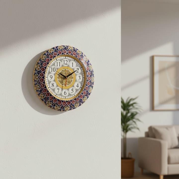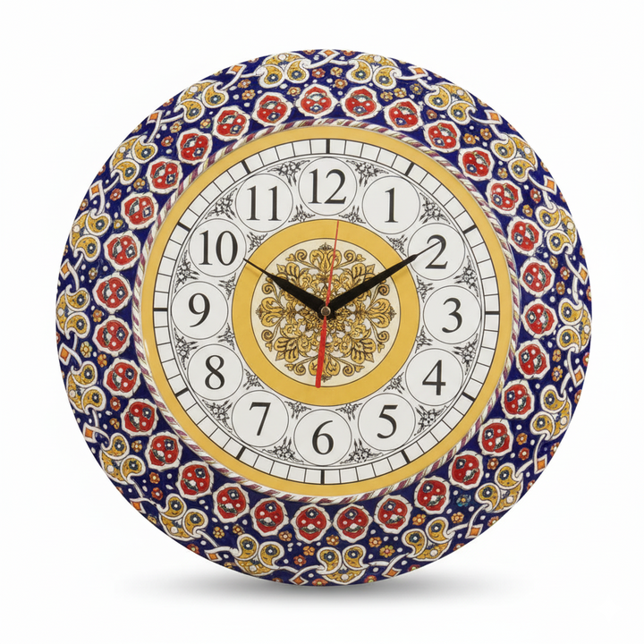 This handcrafted wall clock blends precise functionality with timeless traditional art. Made from glazed ceramic, it features a smooth, glossy finish and a richly decorated circular frame inspired by Persian, Turkish Iznik, or Multani blue pottery styles.