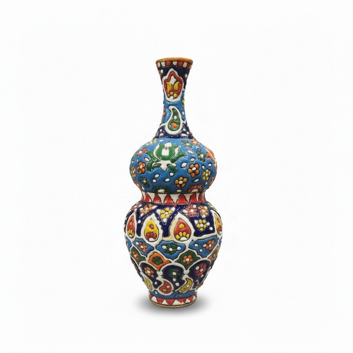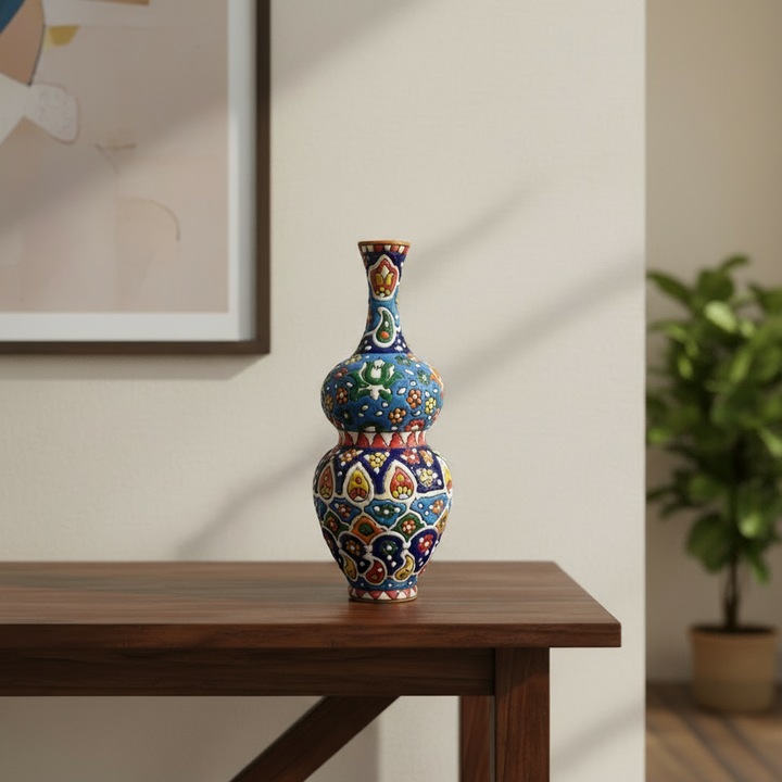 Painted in deep cobalt blue, red, yellow, green, and orange, the vase reflects the essence of traditional Persian and Multani blue pottery. With its ornate form and vibrant patterns, it stands as both a symbol of cultural heritage and a statement of timeless handcrafted beauty.